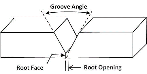 In order to gain access for the welding electrode to the whole depth of the weld, the parts have to be machined to have a wider gap at the top, as is shown in the schematic below. The drawing shows both parts have been machined to form a V-groove between the parts with an included angle of 60 degrees. Now the electrode can have access to the bottom of the weld from where the process will start. If the parts are quite thick that a single pass is not enough to fill up the space, the operator will lay down multiple passes to fill up the groove. Multiple passes themselves posses huge challenges including cleaning, pre-heating, residual stress, and flaw detection. The first pass at the bottom of the groove is the trickiest since it has to bridge the gap and produce good fusion with the weld faces. If the gap is too big, a backing plate can be used and can be left in place after welding. When a backing plate is not used, the first pass may have to be partially gouged out and re-welded from the other side to remove any defects.