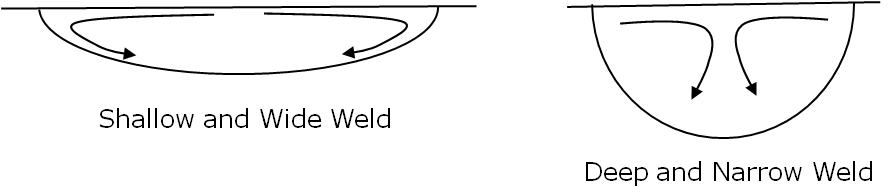 Welding is a particularly energetic manufacturing process where a small volume of metal goes from room temperature to melting point and back in a matter of milliseconds. Once the weld metal reaches a molten state, it begins to flow and swirls around like the wind in a storm. Movement of molten metal is governed by gradients in surface tension. In pure metals and alloys, surface tension decreases as temperature increases. So for a welding process where the exposed surface of the molten metal is smooth and continuous, as is typical on TIG welding and conduction-mode laser welding and electron beam welding, the surface tension is lower at the center of the weld and higher at the edges. The surface tension gradient sets up movement of the liquid from center to the edges, from low to high surface tension. Such an action produces a wide and shallow weld.