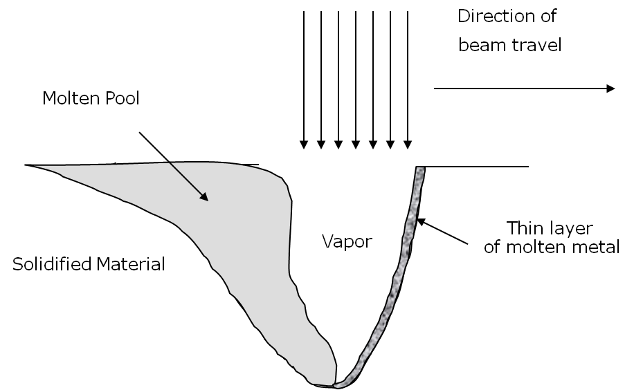 As opposed to the conduction mode welding referred to in the above discussion, keyhole welding is the result of high energy density sources such as plasma, laser, and electron beam that open up a keyhole-shaped cavity in molten metal. At high energy densities, vapor pressure above the molten metal increases substantially and pushes down on the liquid surface opening up a deep cylindrical cavity called the keyhole. The keyhole is a dynamic phenomenon with forces of vapor pressure trying to keep the keyhole open while surface tension of molten metal that forms the wall of the cylindrical cavity tries to close the keyhole. A keyhole can form during both pulsed and seam welding.